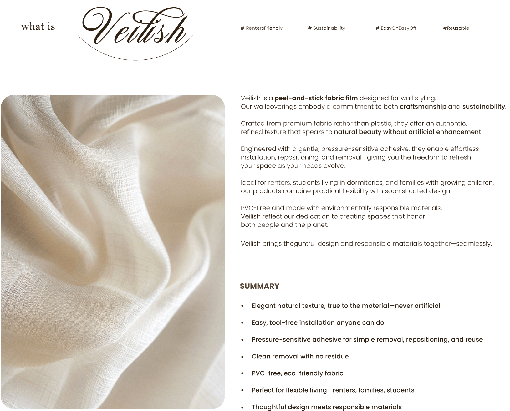 Veilish uses repositionable adhesive, allowing adjustments during installation. (*Do not reposition after fully applied.)